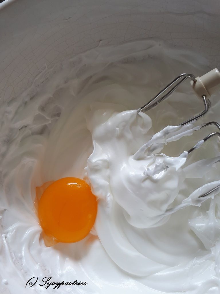 Dès que les blancs forment "un bec d'oiseau", ajoutez les jaunes. Fouettez doucement