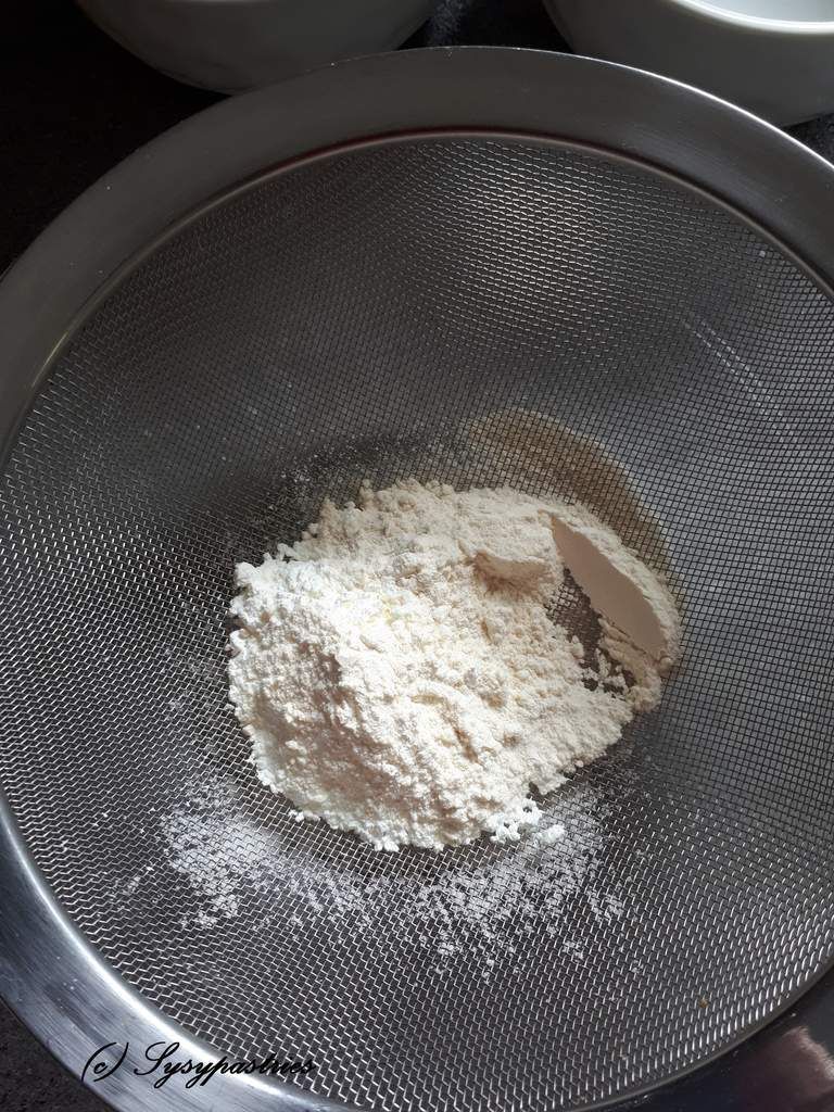 Tamisez la farine, la maïzena et le colorant . Réservez